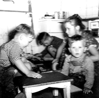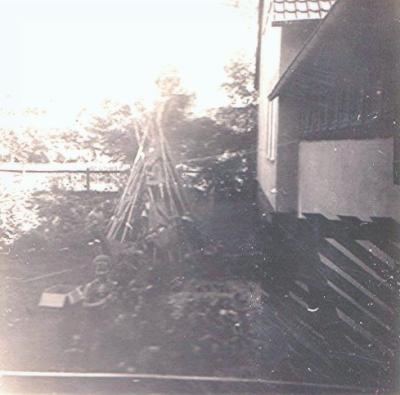 Mit Bohnenstangen hatten wir ein Tipi im Garten aufgebaut. Inzwischen war 1957 mein jüngster Bruder Theodor geboren und auf diesem Bild im Vordergrund mit Feder. (Es war schwierig dies unterbelichtete Foto halbwegs deutlich zu machen.)