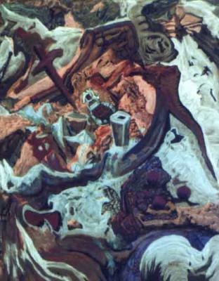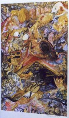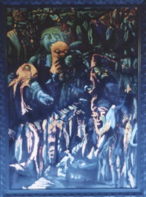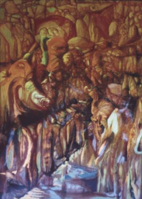 So erfuhr ich, dass die Wasserfarben mit einer phosphoriszierenden Substanz versetzt waren. Sofort begann ich, dieses Phänomen bewusst zu nutzen. Ein Freund und Mitbewohner stellte mir eine Schwarzlichtlampe zur Verfügung , so dass ich auch bei relativer Helligkeit den Leuchteffekt der Farben erkennen und in meine Malerei entsprechend einbauen konnte.